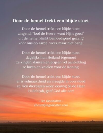 Welkom op de website van Christelijke gedichten! In het menu aan de bovenkant kunt u een passend gedicht zoeken. Er staan inmiddels 381 gedichten en 38 overdenkingen online. In de webshop zijn boeken, dichtbundels en kaarten te koop.